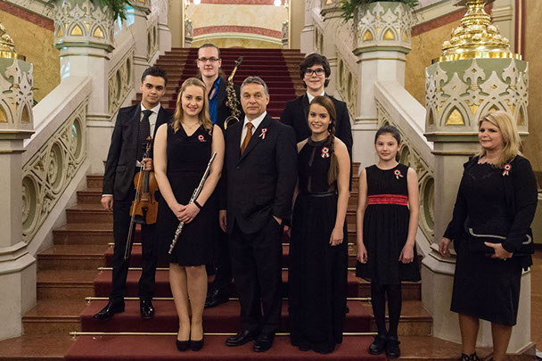 with President János Áder and his wife, Madam Anita Herczegh, the patron of Virtuosos talent show, Miklós Vaszily, and talents from Season 2